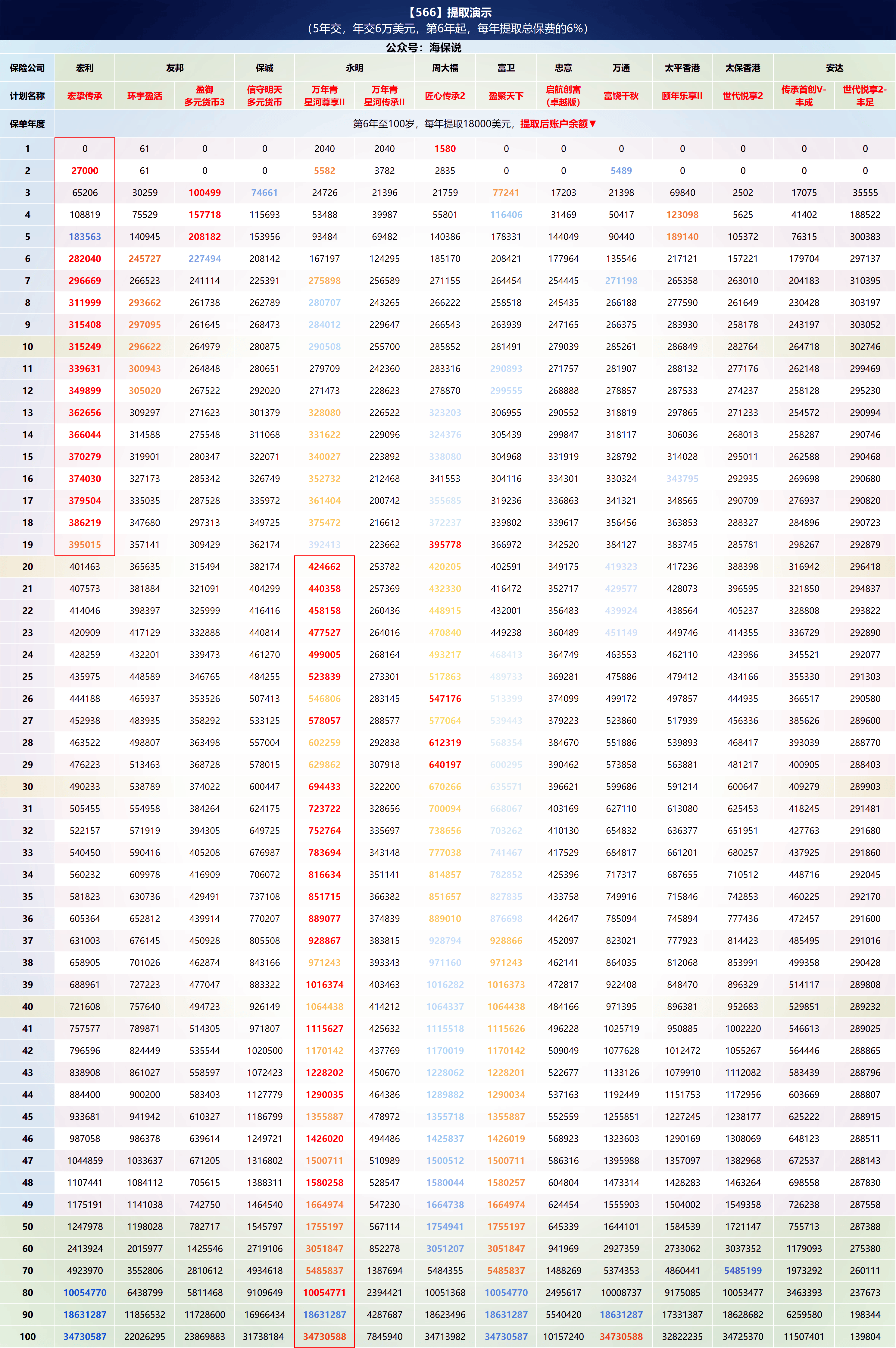 投入30万美金,从第6年开始,每年提取18000美金(总保费6%)的情况下: