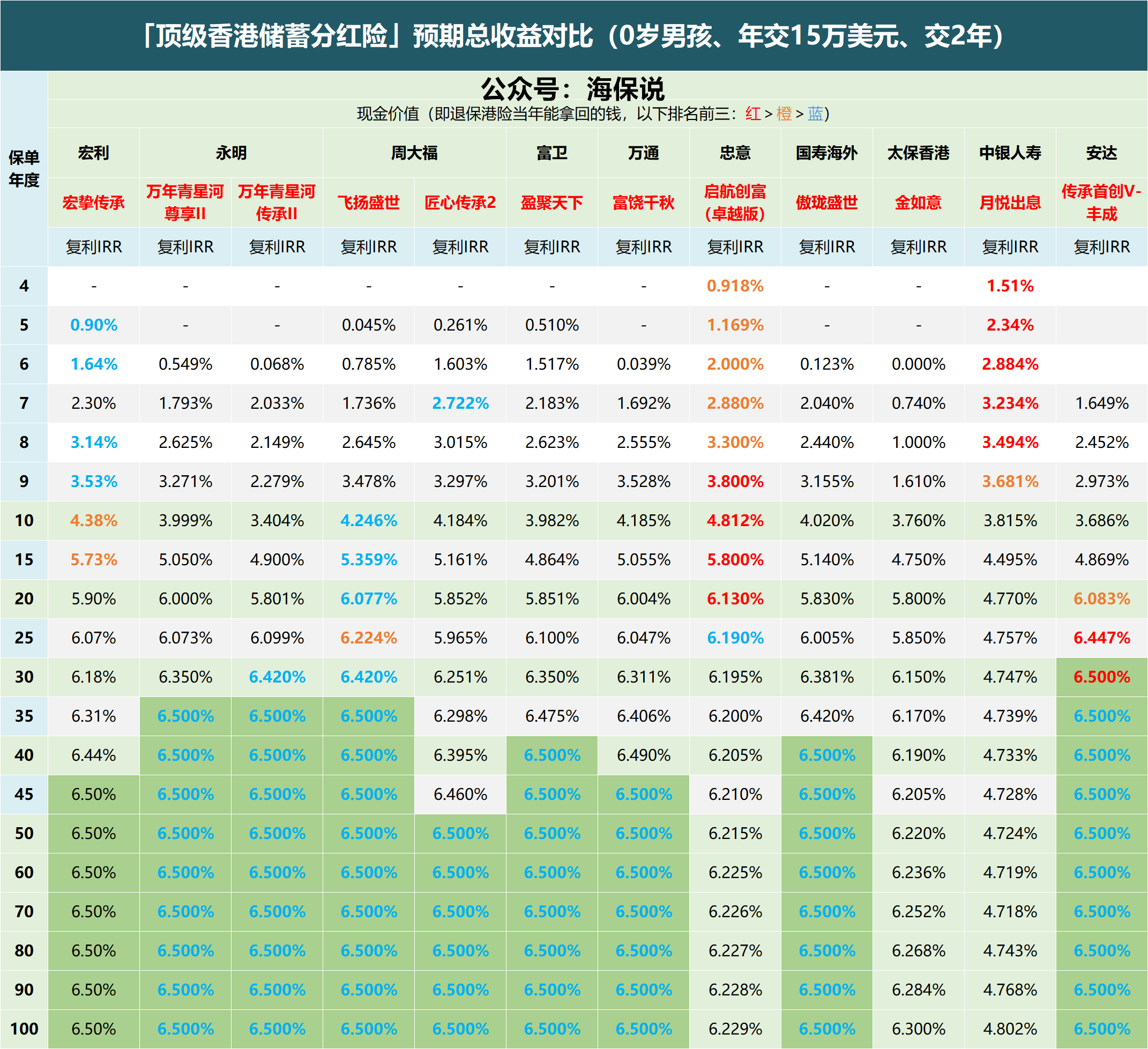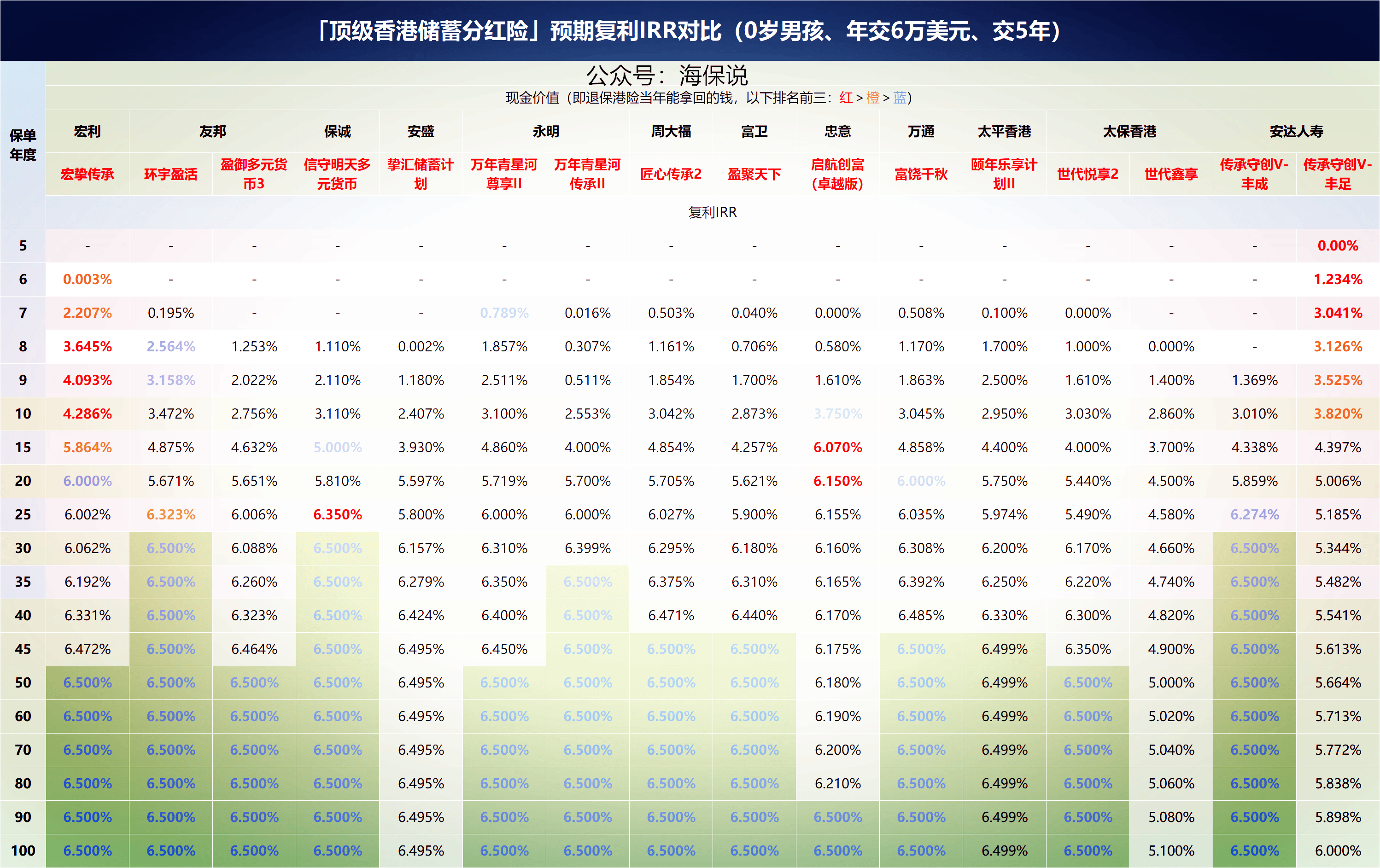 如果按照达到6.5%的时间来看,安达传承首创丰成(27年)、保诚信守明天(28年)、友邦环宇盈活(30年)、永明星河传承II(35年),这4款是表现最好的,彼此差距不大。
