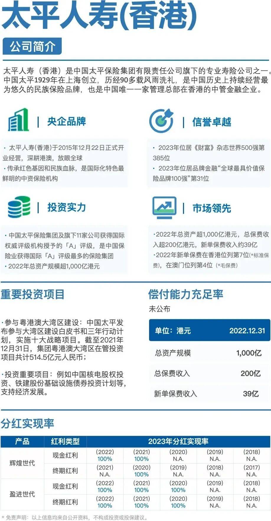 2022年总资产规模超1000亿港元,实现总保费收入超200亿港元,新单保费收入约39亿港元,分別在香港地区位列第七位,澳门地区位列第四位。