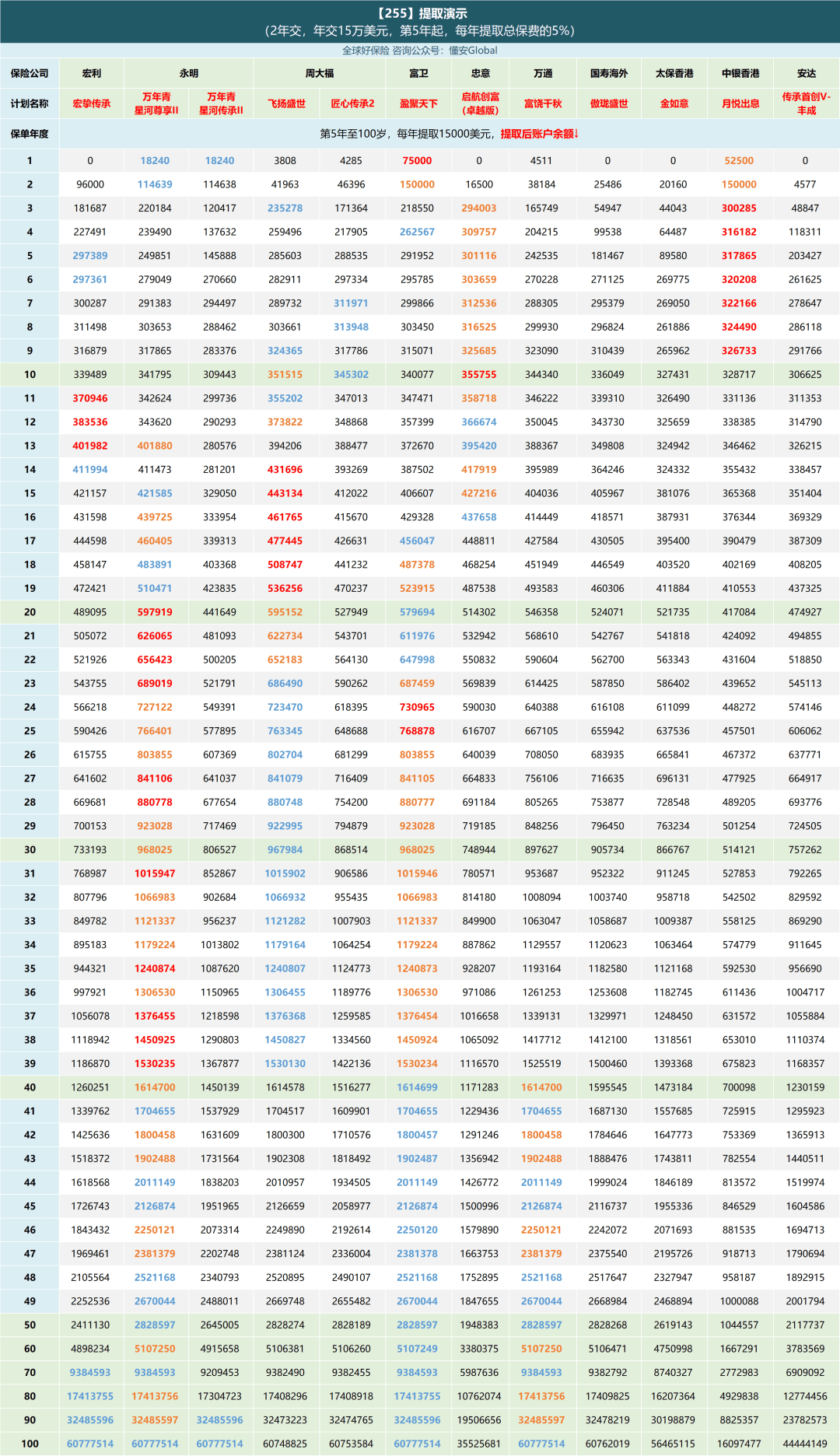投入30万美金,从第5年开始,每年提取15000美金(总保费5%)的情况下: