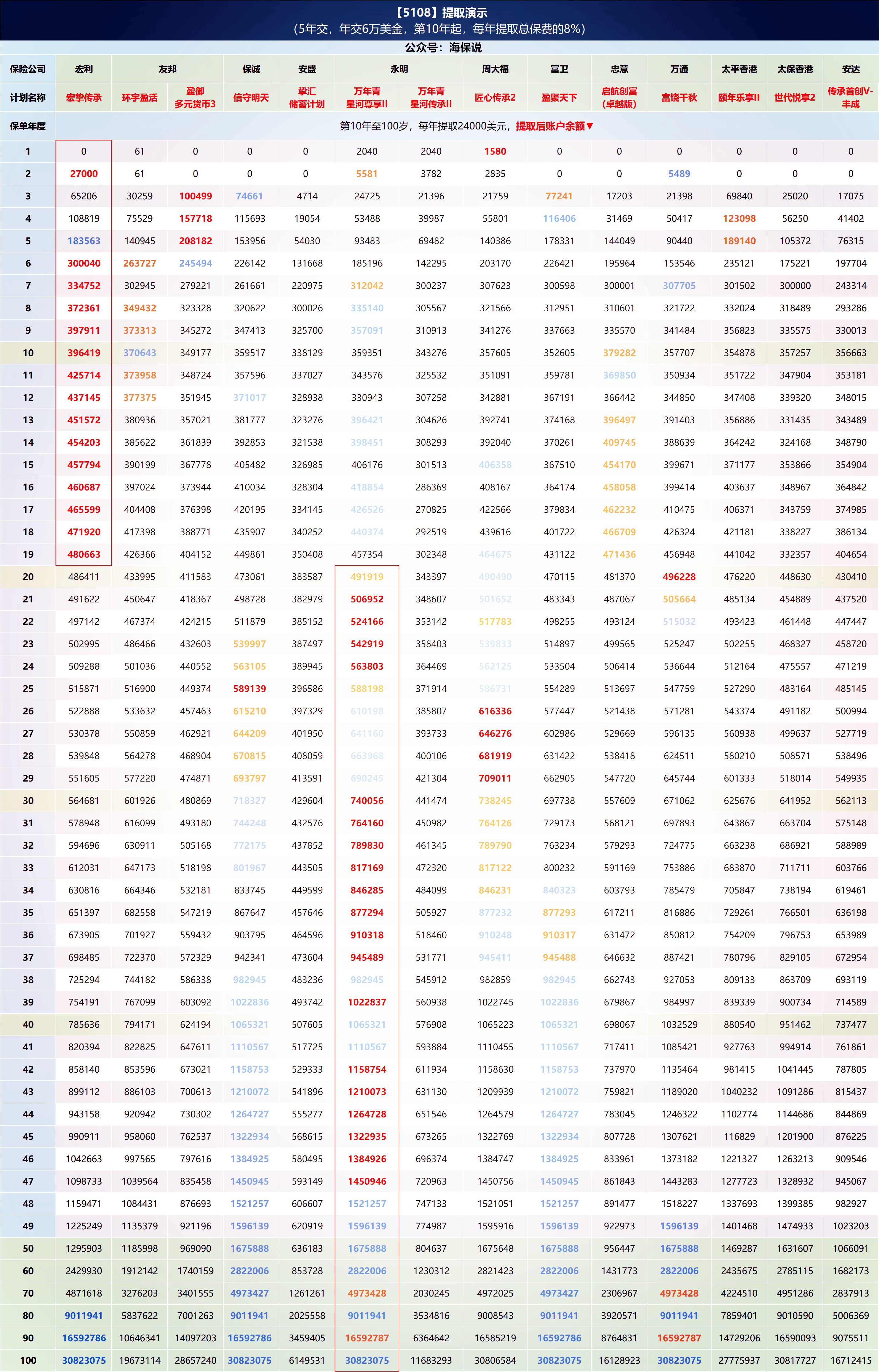 投入30万美金,从第10年开始,每年提取24000美金(总保费8%)的情况下: