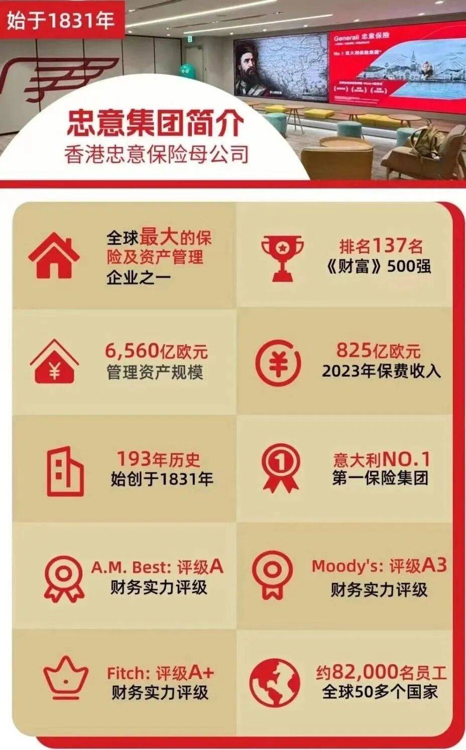 忠意也是全球最大的保险和资产管理企业之一,在《财富》杂志世界500强中长期稳居前100强,并被《福布斯》杂志评为全球最佳的保险集团之一。
