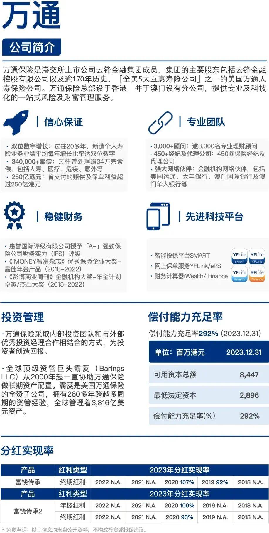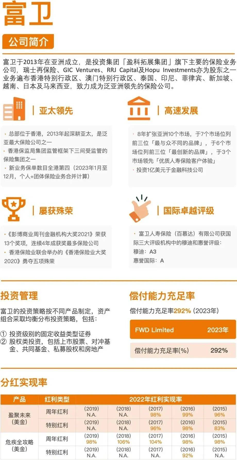通过多笔并购,如19年收购美国大都会的香港业务,富卫快速的发展,目前整个业务规模保持在全港前五,偿付能力比率为292%。