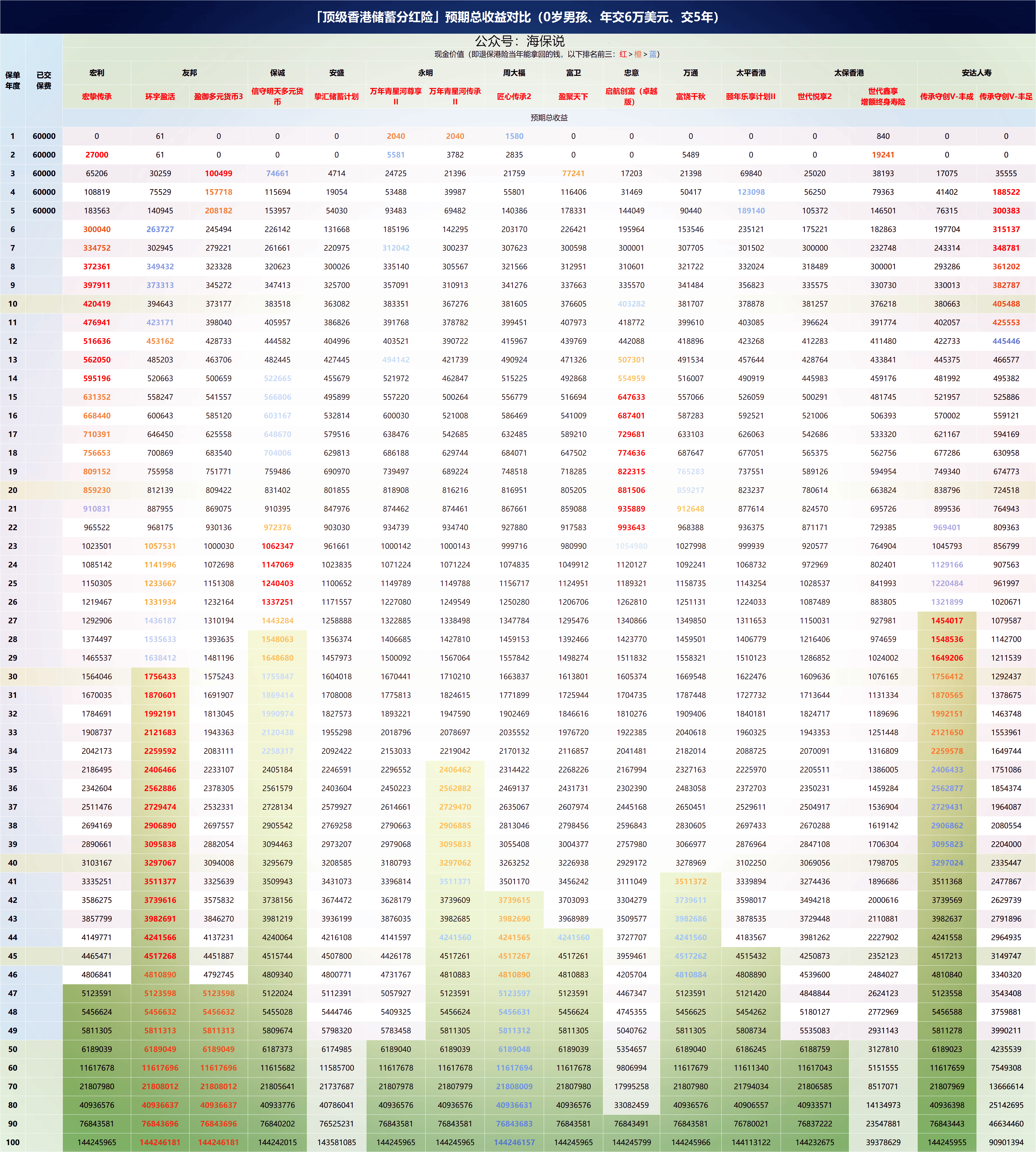 今年7月开始,香港保险实行限高政策,所有产品收益率最高不会超过6.5%,各家产品大概50年之后都看不出什么区别。