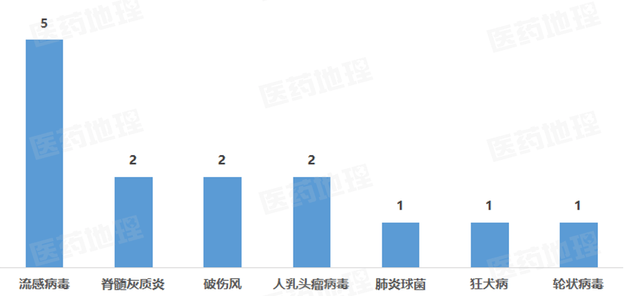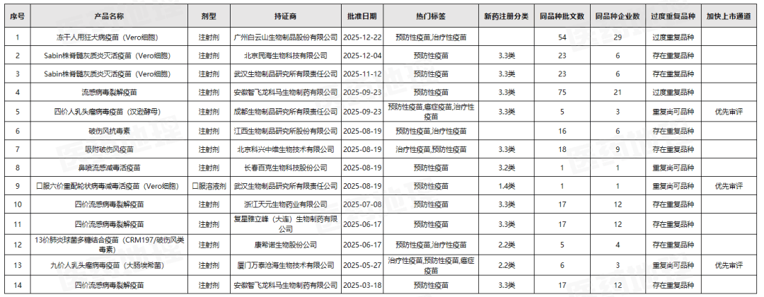 Pharma ONE药物研发大数据平台显示,2025年疫苗产品获批数量为14个,比2024年新增12个。从技术类别分析,其中13项为注射剂型,1项为口服溶液剂型。在新药注册分类方面,包含1个1.4类(口服六价重配轮状病毒减毒活疫苗),2个2.2类(九价人瘤病毒疫苗、13价肺炎球菌多糖结合疫苗),其余主要为3.3类疫苗。从疾病预防领域分布上看,产品覆盖狂犬病、脊髓灰质炎、流感、人瘤病毒感染、破伤风、轮状病毒感染及肺炎球菌性疾病等多个重要公共卫生领域。在审批程序上,有3项产品通过“优先审评”通道加速获批,体现了对临床急需及技术创新产品的政策支持。