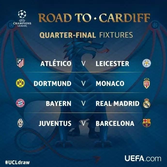 2026-01-12南宫28官网,南宫28官方网站,南宫28APP下载北京时间3月17日晚间,2016-17赛季欧冠1/4决赛抽签结果出炉:马德里竞技 VS 莱斯特城、多特蒙德 VS 摩纳哥、拜仁慕尼黑 VS 皇家马德里、尤文图斯 VS 巴塞罗那。本赛季欧冠1/4决赛首回合将于北京时间4月12日、13日进行,次回合于4月19日、20日进行。