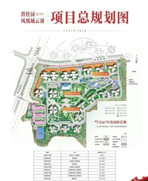 碧桂园·云顶占地面积约12万平方米,总建筑面积36万平方米,整体容积率3.02,绿化率33.6%。项目规划总栋数19栋,塔楼形态为主,总户数3098户。车位配比约1:1.25,物业管理由碧桂园物业提供,服务标准为3.5元/平方米。
