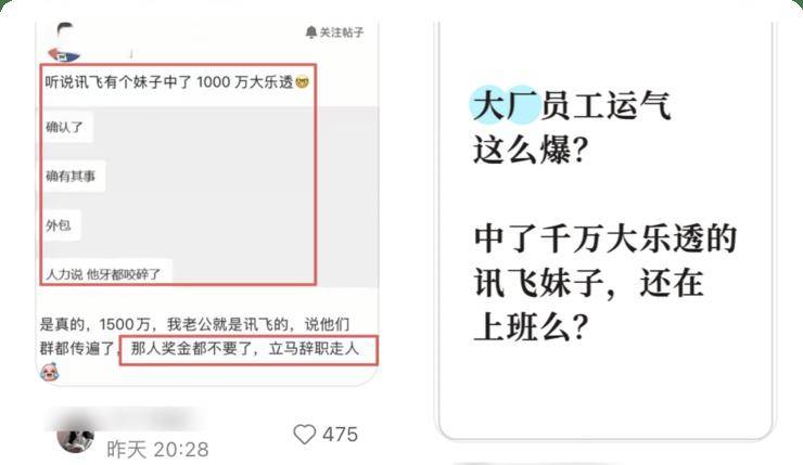 4 月 12 日晚间,“科大讯飞外包员工中千万大奖当场离职”的消息在社交平台疯传,瞬间戳中无数打工人的爽点。据网传版本,这名员工属于讯飞外包岗,买彩票意外中得 1500 万大奖。确认中奖后,Ta 没有丝毫犹豫,直接提交离职申请,连未结算的奖金和工作交接都直接放弃,火速离开公司。消息一出,立刻引发热议。对打工人来说,暴富裸辞就是最极致的精神解脱。按照规则,千万大奖需缴纳 20% 偶然所得税,1500 万税后约 1200 万。这笔钱即便稳健理财,年收入也能达到三四十万,确实足以让普通人告别职场。