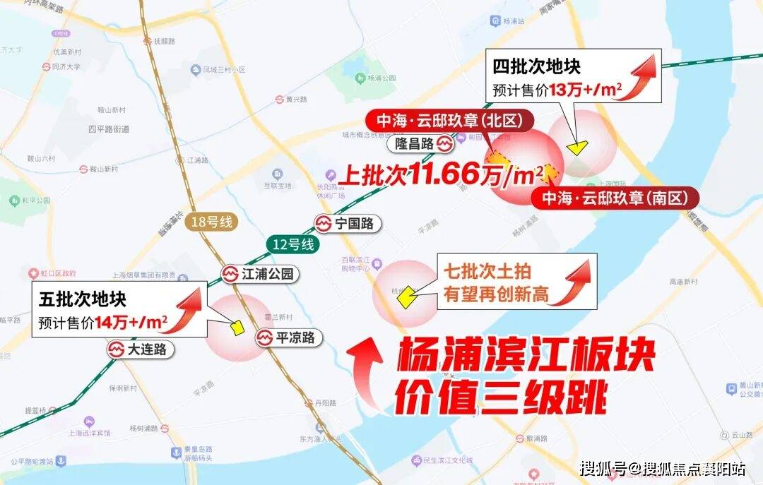 而且项目所在的杨浦滨江板块,近年来土拍市场异常火爆,2024年到2025年,杨浦区接连出让多宗含宅地块,保利、中铁、中建等央国企纷纷落子,2025年5月,项目东面不远处更是拍出板块单价地王,楼面价高达8.02万元/平方米,溢价率26.30%,业内人士预测,该地块未来新房售价可能突破12万元/平方米,这也直接印证了杨浦滨江板块的价值潜力。中海云邸玖章作为板块内的核心项目,2024年先后拿下定海社区多宗地块,楼面价最高达7.33万元/平方米,溢价率16.33%,足见中海对板块发展的信心,也让项目的增值潜力更有保障。