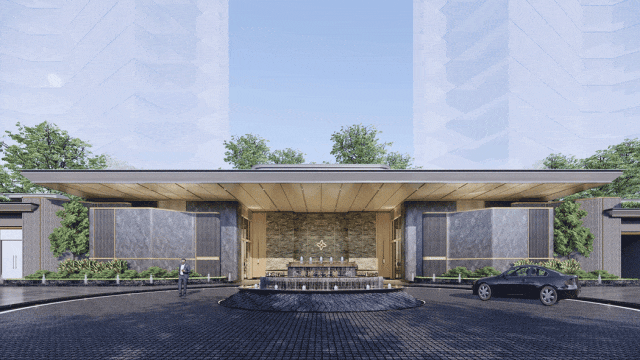 社区入口处,挺拔的灿金门头、以典雅黑灰奢石点缀墙面、再配以酒店式环岛落客区,唯美璀璨水景,奢华且极具辨识度。
