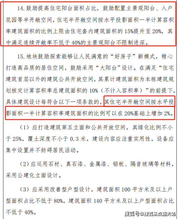 住宅半开敞空间按水平投影面积一半计容建面的比例上限由住宅套内建筑面积的15%提升至 20%,满足连续开敞率不低于40%的主景观阳台不限制进深。